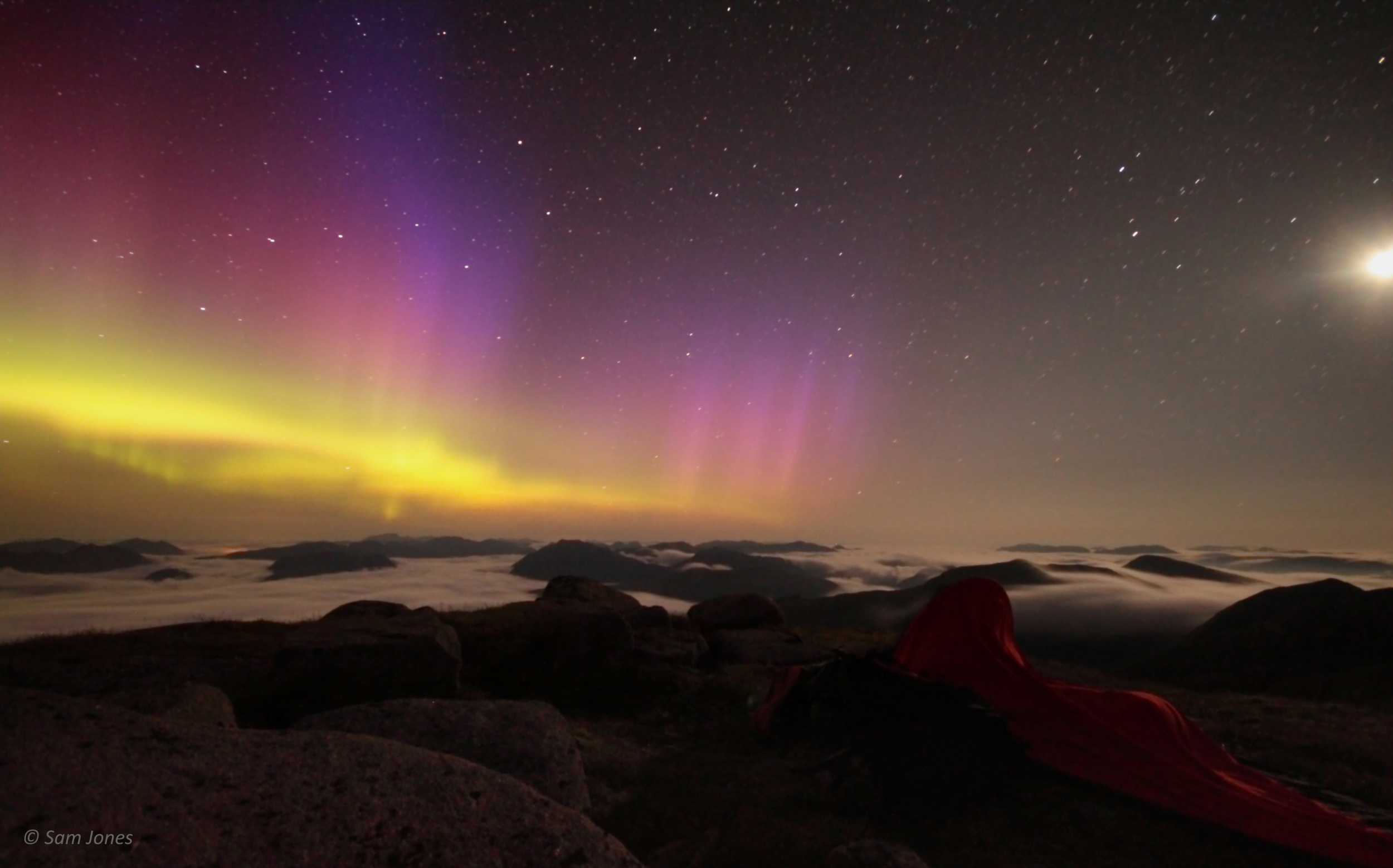 I set the bivi bag up and watched the cloud drift in far below. The sun dropped behind the peaks of Mull, leaving a rich orange glow in the west I’ve come to associate with evenings spent up high. I watched Marie and Jacq’s headtorches a mile or so away in the saddle until they switched off. By 10 pm the residual glow had disappeared completely and the clouds effectively blocked what little light pollution there was. Initially the only illumination was from the rising Milky Way; bright against the thick blackness below. No wind; absolute silence. Around 10:30 the aurora began to flicker into life in the north. The clouds had filled in completely to form an unbroken sea stretching between horizons. I’m sure there are more dramatic mountain vistas in the Highlands than Cruachan can offer, but it is hard to beat for unimpeded visibility – it’s the tallest thing around. Tonight, there was absolutely nothing obstructing the view until the curvature of the Earth got in the way.