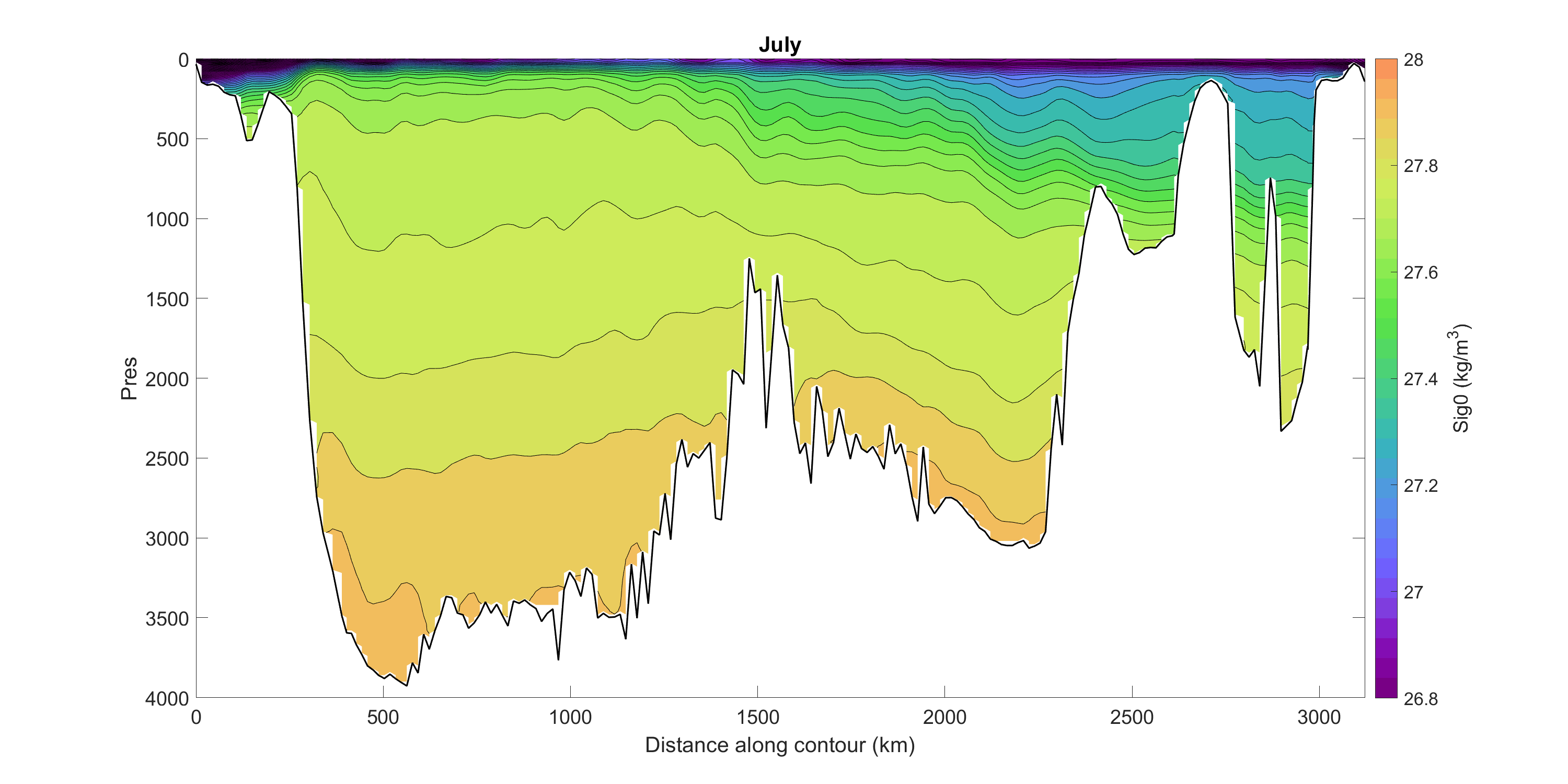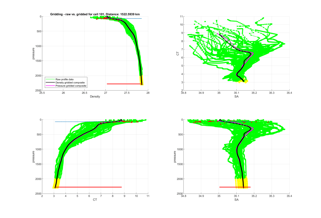 Observations consist mainly of CTD data at the continental margins, and Argo data in the ocean interior. I populate an initial month-mean climatology using an expanding search window, and grid in density space. This ‘average month’ climatology forms the basis for the time-varying climatology, by comparing its T and S properties and vertical gradients to the individual data profiles, and warping in 3D (x-distance, depth, time) to try to minimise error. Finally, the gridded profiles are stabilised using the Gibbs Seawater functions.