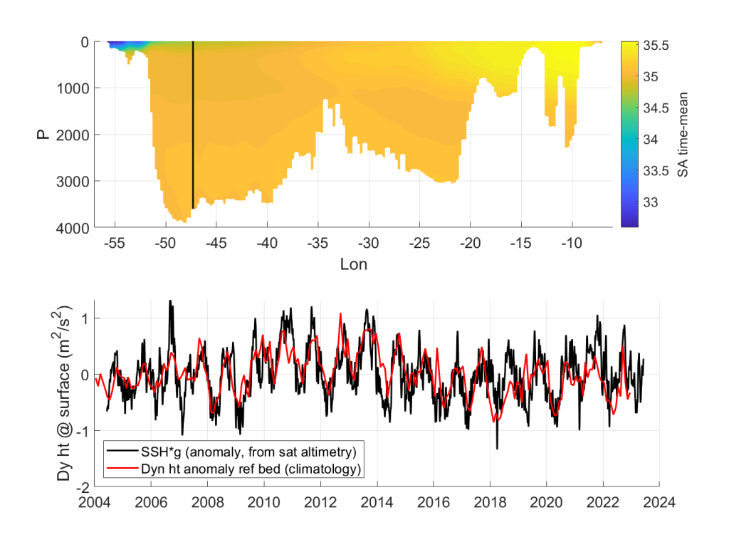 We are still in the process of validating the climatology, but initial tests are promising. In particular, it is possible to compare the dynamic height inferred from the gridded water properties to the sea surface height obtained from satellite. Even in sparsely-sampled regions this comparison shows good coherence between the two.